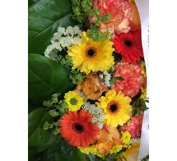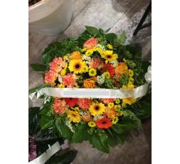 Coussin de deuil dans les tons orangés. Une belle composition florale qui accompagnera vos messages.