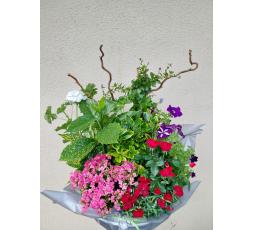 Assemblage composé de plantes fleuries et complété avec de beaux végétaux.