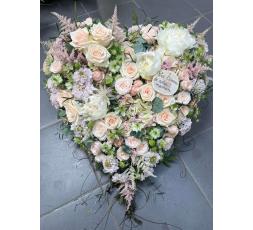 L'ensemble de la composition peut être soigneusement agrémenté d'une inscription assorti, créant ainsi un hommage floral élégant et pleins de tendresse. Cette composition de cœur de fleurs tendre est un moyen délicat et touchant de dire adieu à un être cher et de lui offrir un dernier hommage floral.