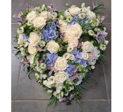 Coeur de fleurs pour un deuil composé de fleurs de saison. Un cœur de fleurs pour un deuil est un hommage touchant et symbolique envers une personne chère disparue. Pour cette composition, les fleurs dans les tons blanc et bleu ont été choisies pour leur douceur et leur élégance. Le cœur est réalisé avec différentes variétés de fleurs.