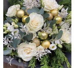 Adèle, superbe bouquet de Noël, composé de roses blanches et de fleurs dans les tons blancs et verts. Les boules dorées de Noël donneront à ce bouquet l'aspect festif qui le caractérise pour un merveilleux noël.