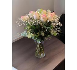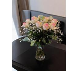 Ce bouquet élégant est rempli de roses roses fraîches, accompagnées de délicates gypsophiles et de feuillage d'eucalyptus, créant une composition florale raffinée et romantique. Les roses, symboles d'amour et de beauté, s'épanouissent avec grâce, tandis que les gypsophiles ajoutent une touche de légèreté et de douceur. Parfait pour embellir n'importe quel espace, ce bouquet apportera une atmosphère chaleureuse et accueillante à votre intérieur.