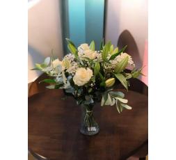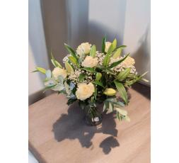 Ce bouquet élégant, orné de roses blanches éclatantes et de gypsophiles délicats, apporte une touche de fraîcheur à toute décoration intérieure. Les lys ajoutent une note de sophistication, tandis que l'eucalyptus complète harmonieusement l'ensemble, créant un arrangement floral à la fois raffiné et apaisant. Idéal pour embellir une table, ce bouquet est parfait pour toutes les occasions, qu'il s'agisse d'un dîner formel ou d'une simple réunion entre amis.