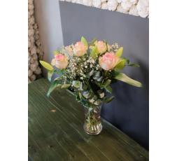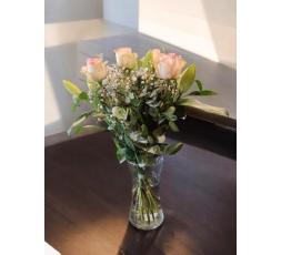 Ce bouquet élégant, orné de roses roses fraîches, apporte une touche de douceur à toute décoration intérieure. Accompagné de lys délicats, de gypsophiles aériennes et de feuilles d'eucalyptus, il crée un ensemble harmonieux et raffiné. Parfait pour égayer une table, ce bouquet est idéal pour célébrer des moments spéciaux ou simplement pour embellir votre quotidien.